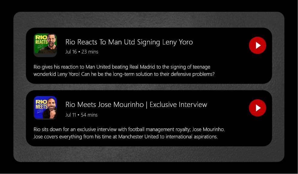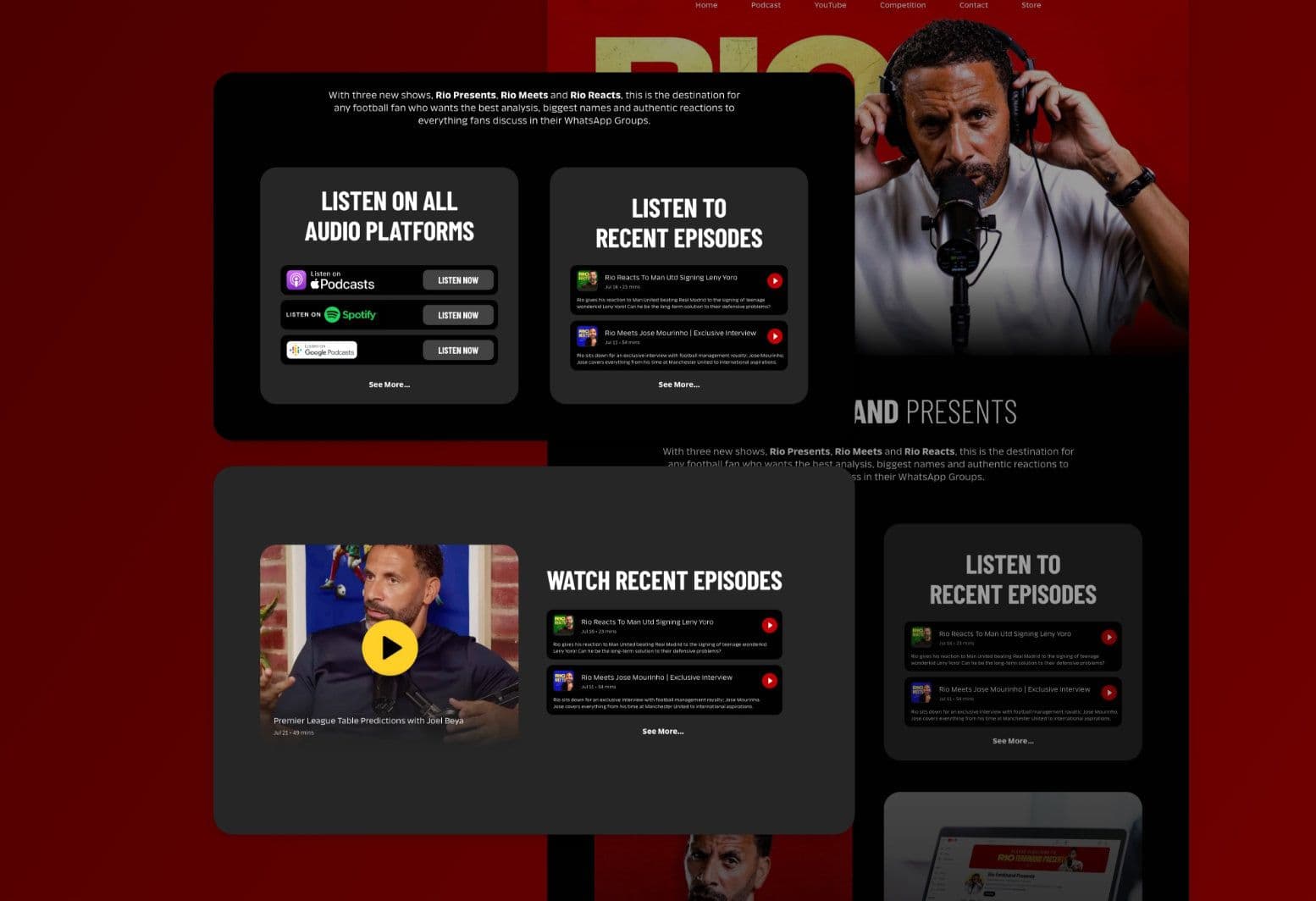 - Designed a sleek, user-friendly website that acts as a central hub for Rio Ferdinand’s podcast and related content.
